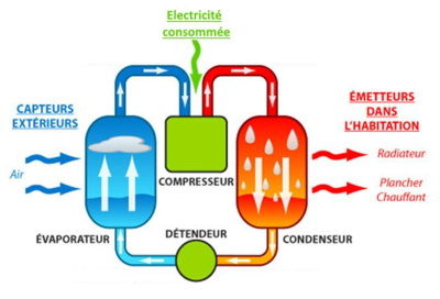 Une pompe à chaleur prélève de la chaleur de l’environnement (l’air extérieur dans le cas d’une aérothermie, le plus courant) et la transfère dans le bâtiment via le système de chauffage. Pour réaliser ce transfert, elle consomme de l’électricité au niveau du compresseur.